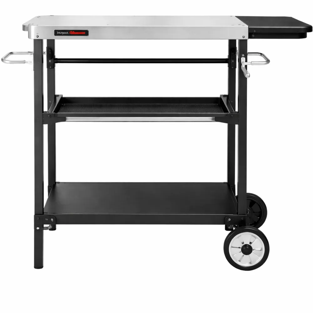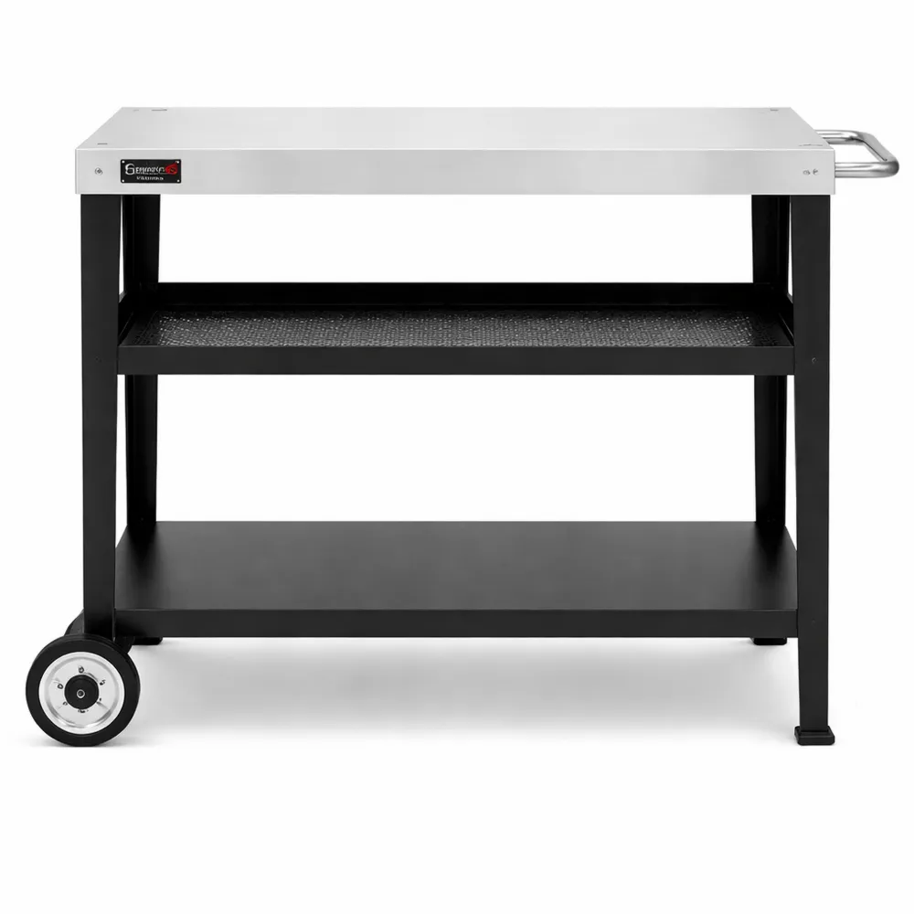 Tavolo multifunzionale adatto sia per interni che per esterni, utilizzabile come piano di lavoro o supporto. Sul piano in acciaio inox di 85 x 50 cm, è possibile preparare il cibo. I due ripiani inferiori offrono spazio per utensili o scatole. Dispone di un porta sacco rimovibile per la spazzatura. Struttura robusta con piano in acciaio inossidabile e telaio tubolare in acciaio. Facilmente spostabile grazie alle due ruote e al manico laterale.